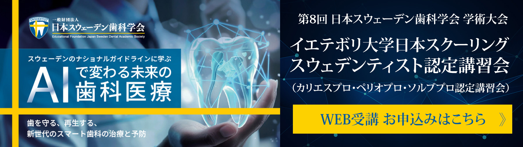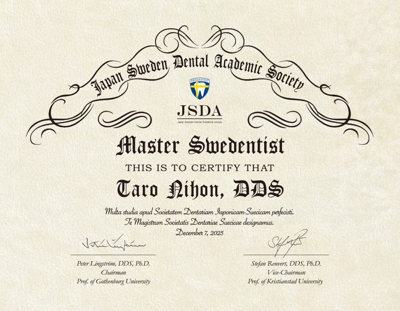 スウェデンティスト認定制度 歯科先進国スウェーデン式の予防と治療を、日本のスタンダードへ 日本スウェーデン歯科学会は、科学的に効果が実証されたプログラムに則り、スウェーデン式の最新の歯科知識と技術を日本に普及することを目的として活動しています。 当学会では、この活動目的をより確実なものとし、日々の診療で実践される医療従事者の皆様を支援するため、「スウェデンティスト認定制度」を制定いたしました。 本制度は、スウェーデンスタイルの予防と治療を正しく理解し、真摯に取り組む歯科医師・歯科衛生士の皆様を「スウェデンティスト」として認定するものです。 本制度を通じて、日本の歯科医療におけるスウェーデン式予防・治療のさらなる普及と発展を目指します。 Swedentist 認定制度 スウェデンティスト 「スウェデンティスト」とは、スウェーデンスタイルの予防と治療を理解し、 積極的に取り組む歯科医師と歯科衛生士の称号です。 本セミナーを受講された日本スウェーデン歯科学会員様には スウェデンティスト認定証を授与いたします。 Master Swedentist 認定制度 マスタースウェデンティスト 「マスタースウェデンティスト」とは、日本スウェーデン歯科学会正会員として8年にわたり在籍し、スウェデンティスト認定を累計8回取得された会員様に対し、その長年の研鑽とスウェーデン式歯科医療の普及への貢献を称えて授与される特別な称号です。 セミナーのお申し込みはこちら