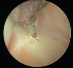 顎関節鏡検査のもう一つの適応症は、再発性顎関節脱臼の治療です。繰り返し脱臼する関節の椎間板後部付着部を硬化させることにより、最小限の侵襲で将来の脱臼を回避します(図1)(4、5)。