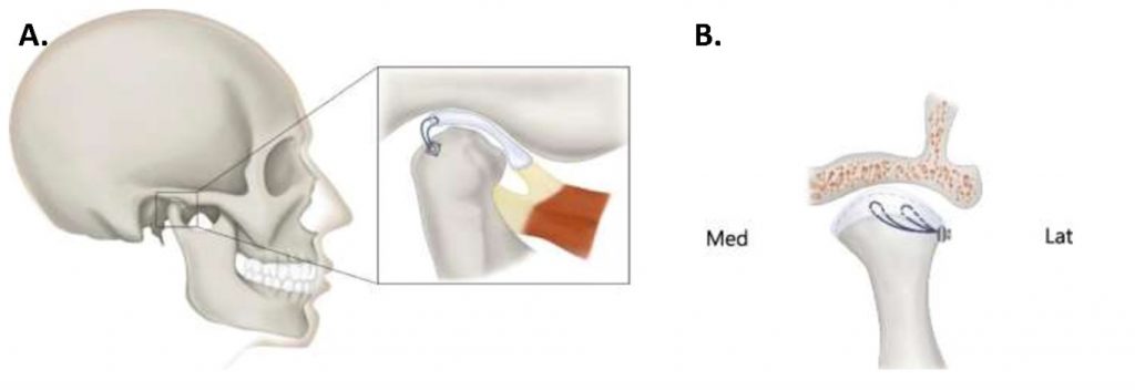 手術は全身麻酔下で行われ、1つの関節につき約60~90分かかります。いわゆる耳介前入口を操作して外側関節包を露出させ、外側関節包を開きます。椎間板縮小術は、椎間板を後方に移動させる必要がある量だけ、後方に伸びた椎間板付着部を外科的に縮小することによって行われます。この方法は、いわゆる骨アンカーと組み合わせて使用されることもあり、椎間板の安定性が向上すると考えられています(図1)(2)。これにより、ディスクが再びずれることが防止されます。